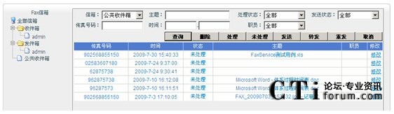 打開瀏覽器,輸入WebFax管理網(wǎng)站的地址,登陸,然后通過(guò)這個(gè)網(wǎng)站,查看收發(fā)傳真的狀態(tài),及接收傳真的圖像?梢赃M(jìn)行查詢、下載、發(fā)送、轉(zhuǎn)發(fā)、重發(fā)和刪除傳真。