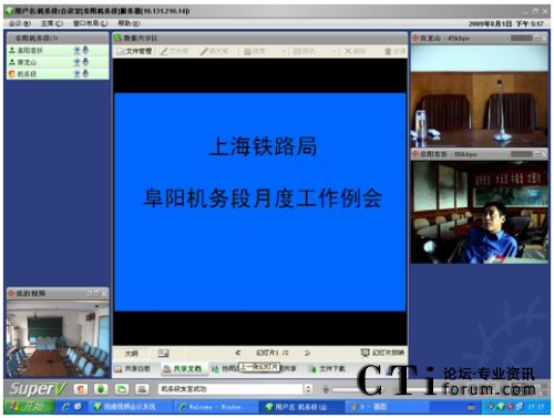 CTI論壇(ctiforum)08月06日消息: 日前,京九干線主力機務段——上海鐵路局阜陽機務段成功啟動視維Super-V視頻會議系統(tǒng)。阜陽機務段的領導和職工,每天早上8點上班后,第一件事情就是登陸視頻會議系統(tǒng),匯報前日工作情況、部署當日工作內容。已然,山大聯(lián)潤為上海路局阜陽機務段部署的阜陽機務段視頻會議系統(tǒng),成為鐵路部門必不可少的遠程溝通交流工具,在有效提高鐵路系統(tǒng)溝通效率的同時,保障了鐵路運輸?shù)陌踩瑯O大滿足了鐵路部門暑期運營業(yè)務對溝通和會議的需求。CTI論壇報道