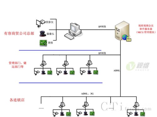 有容商貿(mào)大規(guī)模網(wǎng)絡(luò)遠(yuǎn)程會(huì)議和培訓(xùn)系統(tǒng)由服務(wù)器端和客戶(hù)端組成,服務(wù)器端軟件部署在公司中心機(jī)房,中心機(jī)房配置1臺(tái)單獨(dú)服務(wù)器,支持400個(gè)客戶(hù)端同時(shí)在線(xiàn),負(fù)責(zé)所有會(huì)議和培訓(xùn)的召集、音視頻交互、加密等工作,有容商貿(mào)各部門(mén)、轄下各連鎖店通過(guò)WEB方式(包括ADSL、3G無(wú)線(xiàn)等多種網(wǎng)絡(luò))即可實(shí)現(xiàn)客戶(hù)端軟件的自動(dòng)安裝與升級(jí),配備簡(jiǎn)單的攝像頭和話(huà)筒之后就可以實(shí)現(xiàn)有容商貿(mào)以及連鎖店的大規(guī)模工作會(huì)議和高清音視頻網(wǎng)絡(luò)培訓(xùn)。網(wǎng)絡(luò)拓?fù)鋱D如下: