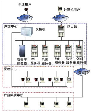 系統(tǒng)的體系結(jié)構(gòu),主要包括三個(gè)部分:數(shù)據(jù)中心、受理中心和維護(hù)中心。受理中心與數(shù)據(jù)中心之間采用E1連接,具有2M的數(shù)據(jù)通信能力;維護(hù)中心與數(shù)據(jù)中心之間采用64K DDN線路連接,三個(gè)中心分布在三個(gè)不同的地方。目前受理中心負(fù)責(zé)全省的所有業(yè)務(wù),客戶通過本地市話經(jīng)由移動(dòng)電信網(wǎng)絡(luò)將話路指向受理中心,通過數(shù)據(jù)中心的具有排隊(duì)功能的交換機(jī),根據(jù)被叫號(hào)碼和客戶服務(wù)要求,將講話路轉(zhuǎn)接到自動(dòng)臺(tái)或人工臺(tái)席,為客戶提供服務(wù)。當(dāng)用戶呼叫信息臺(tái)電話后,進(jìn)入到交換機(jī),交換機(jī)將來話消息通知驅(qū)動(dòng)池,驅(qū)動(dòng)池將相關(guān)消息轉(zhuǎn)換為標(biāo)準(zhǔn)格式,通知CCMS,CCMS根據(jù)來話被叫號(hào),根據(jù)管理系統(tǒng)的定義,啟動(dòng)相應(yīng)的IVR腳本,交給IVR解釋器解釋并由IVR服務(wù)器執(zhí)行,當(dāng)服務(wù)為自動(dòng)臺(tái)完成時(shí),由IVR服務(wù)器實(shí)現(xiàn)(如:語音引導(dǎo)、適合自動(dòng)服務(wù)的內(nèi)容等);當(dāng)用戶需要人工服務(wù)時(shí),CCMS管理系統(tǒng),根據(jù)用戶的服務(wù)要求,按照話路分配原則(通過管理系統(tǒng)定義),選擇最合適的話務(wù)員為其服務(wù),同時(shí)CCMS管理系統(tǒng)會(huì)將相關(guān)的頁面在話務(wù)員的臺(tái)席上顯示出來,同時(shí)顯示主叫號(hào)碼以及來話標(biāo)示,當(dāng)話務(wù)員應(yīng)答后,即可開始受理,受理的內(nèi)容通過Web服務(wù)器完成,同時(shí)對(duì)于需要查詢數(shù)據(jù)庫的訪問,通過應(yīng)用服務(wù)器,進(jìn)行數(shù)據(jù)訪問,并返回結(jié)果。當(dāng)服務(wù)完畢,本次呼叫即結(jié)束。
