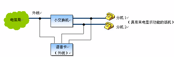 說明:將語(yǔ)音卡的外線通道并接在小交換機(jī)的全部?jī)?nèi)外線端口上,在軟件的控制下,不僅可以將外線來電號(hào)碼轉(zhuǎn)發(fā)至分機(jī),并且還可以在內(nèi)線通話時(shí),看到通話對(duì)方的號(hào)碼,非常實(shí)用。當(dāng)然,如果直接采用語(yǔ)音卡(外線+座席)來構(gòu)成小交換機(jī),則系統(tǒng)更為簡(jiǎn)潔,成本也大為降低。
