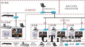 本次系統(tǒng)根據(jù)各會場不同規(guī)模的應(yīng)用,共采用了1臺Sony PCS-G50P、29臺Sony PCS-1P,每臺終端還配置了用于PC圖文傳輸?shù)碾p流盒,共30個。多點控制單元(MCU)采用超然的VmediaX VX4000-T(32個點)。系統(tǒng)拓?fù)鋱D如下: