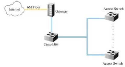 客房局域網(wǎng)通過一條6M的光纖接入CNC網(wǎng)絡(luò),網(wǎng)關(guān)設(shè)備承擔(dān)了DHCP、NAT和流量限制等功能,同時在思科6504上安裝有安全板卡,對內(nèi)部網(wǎng)絡(luò)安全進(jìn)行加強(qiáng)和防御。由于每個客房有2~3個信息點(diǎn),客房局域網(wǎng)總共有1300個左右的信息點(diǎn)。