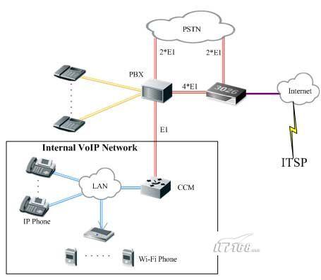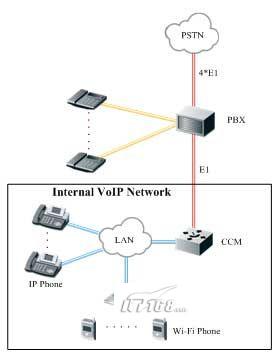 酒店申請(qǐng)了4條到CNC的E1線路,用于語(yǔ)音呼叫業(yè)務(wù),同時(shí)內(nèi)部還建設(shè)有覆蓋整個(gè)酒店的VoIP網(wǎng)絡(luò),通過CCM系統(tǒng)進(jìn)行集中管理,CCM系統(tǒng)與PBX之間通過E1線進(jìn)行連接。