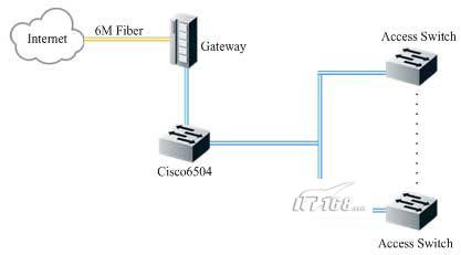 客房局域網(wǎng)通過一條6M的光纖接入CNC網(wǎng)絡(luò),網(wǎng)關(guān)設(shè)備承擔(dān)了DHCP、NAT和流量限制等功能,同時(shí)在思科6504上安裝有安全板卡,對(duì)內(nèi)部網(wǎng)絡(luò)安全進(jìn)行加強(qiáng)和防御。由于每個(gè)客房有2~3個(gè)信息點(diǎn),客房局域網(wǎng)總共有1300個(gè)左右的信息點(diǎn)。
