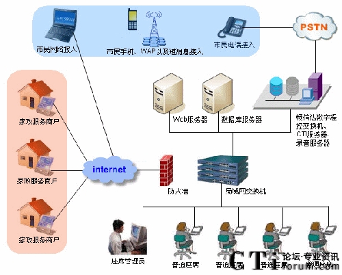隨著國(guó)內(nèi)城市化地不斷加快,人口老齡化的加劇,人民群眾對(duì)家政服務(wù)需求也越來(lái)越旺盛,家政服務(wù)業(yè)的重要性也日益凸顯。為了規(guī)范家政服務(wù)市場(chǎng)、整合家政市場(chǎng)資源、培育家政服務(wù)示范性企業(yè),國(guó)家商務(wù)部、財(cái)務(wù)部于2009年4月下發(fā)了《關(guān)于推進(jìn)家政服務(wù)網(wǎng)絡(luò)體系建設(shè)的通知》的149號(hào)文件,啟動(dòng)了家政服務(wù)網(wǎng)絡(luò)中心體系建設(shè)的項(xiàng)目,并提出了具體的規(guī)范和要求。以此為起點(diǎn),為更好地服務(wù)社會(huì)滿足人民群眾日益增長(zhǎng)的生活需求而努力。自文件下發(fā)以來(lái),我公司就組織專門的項(xiàng)目組,對(duì)家政服務(wù)行業(yè)具體業(yè)務(wù)需求的調(diào)研以及開發(fā)工作。公司利用多年的開發(fā)經(jīng)驗(yàn),經(jīng)過幾個(gè)月的努力,終于在8月份完成了暢信達(dá)家政服務(wù)網(wǎng)絡(luò)中心的全套建設(shè)方案。與其它系統(tǒng)固化的功能設(shè)計(jì)不同,該方案可以靈活地定制業(yè)務(wù)模塊,方便各地的家政公司根據(jù)本市的情況和需求,確定適合自身的業(yè)務(wù)流程。系統(tǒng)業(yè)務(wù)模塊完整地覆蓋了家政服務(wù)的業(yè)務(wù)范圍與重點(diǎn)。并將家政服務(wù)的業(yè)務(wù)分為營(yíng)業(yè)系統(tǒng)、賬務(wù)系統(tǒng)、后臺(tái)系統(tǒng)等部分,貫穿了市民從訴求提交、工單派發(fā)、工單處理、財(cái)務(wù)結(jié)算到回訪反饋的各個(gè)方面。系統(tǒng)還提供了完善的報(bào)表模塊準(zhǔn)確反映業(yè)務(wù)和系統(tǒng)運(yùn)營(yíng)狀況,有力地支持對(duì)平臺(tái)進(jìn)行運(yùn)營(yíng)管理工作。另外在方案設(shè)計(jì)上,除了滿足業(yè)務(wù)處理需要外,還充分考慮到系統(tǒng)的適應(yīng)性、穩(wěn)定性和處理的能力。首先為了滿足各地市對(duì)家政平臺(tái)的不同需求,公司專門推出了基于IBM服務(wù)器的和暢信達(dá)標(biāo)配服務(wù)器的兩種建設(shè)方案。暢信達(dá)標(biāo)配服務(wù)器方案可提供最低4模擬外線最多1條數(shù)字中繼(E1)接入,適用于初期規(guī)模較小且投資規(guī)模不大的客戶。而基于IBM服務(wù)器的方案,則主要是滿足業(yè)務(wù)量較大,同時(shí)對(duì)設(shè)備配置要求高的城市,以數(shù)字線接入為主。多種建設(shè)模式充分體現(xiàn)了方案的靈活性、可擴(kuò)展性的特征,有效地減少了運(yùn)營(yíng)風(fēng)險(xiǎn),提升了個(gè)性化定制化服務(wù)的水平。其次,根據(jù)家政市場(chǎng)需求預(yù)測(cè)以及已開通家政服務(wù)網(wǎng)絡(luò)中心城市的實(shí)際運(yùn)營(yíng)情況,一個(gè)中型城市,預(yù)計(jì)電話開通之后,話務(wù)量平均每天近3000個(gè),這就要求系統(tǒng)不但有穩(wěn)定的性能而且要有強(qiáng)大的處理能力。我公司從系統(tǒng)平臺(tái)構(gòu)建、業(yè)務(wù)流程設(shè)計(jì)、設(shè)備性能、組網(wǎng)設(shè)計(jì)等方面著手,為系統(tǒng)提供了足以確保安全穩(wěn)定運(yùn)行的支持。青島暢信達(dá)通信有限公司家政服務(wù)網(wǎng)絡(luò)中心方案架構(gòu)圖