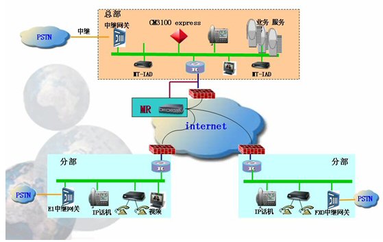 由于電信運(yùn)營商的線路租賃費(fèi)用非常昂貴,對(duì)于中小企業(yè)來說是一項(xiàng)不小的負(fù)擔(dān),所以中小企業(yè)的組網(wǎng)方式一般采用ADSL方式,來降低費(fèi)用,而ADSL的組網(wǎng)方式往往都經(jīng)過了幾層地址轉(zhuǎn)換了,這樣在分部或分支機(jī)構(gòu)的IP電話終端就無法穿透防火墻,實(shí)現(xiàn)和外面成功通話,所以需要在總部配置1臺(tái)媒體路由器(MR)來做語音代理,完成呼叫連接的建立。