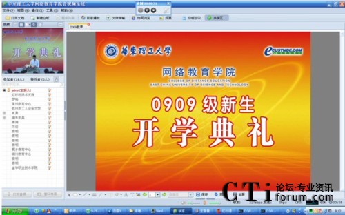 CTI論壇(ctiforum)9月30日消息:9月26日,華東理工大學(xué)網(wǎng)絡(luò)教育學(xué)院09級(jí)新生開學(xué)典禮上午9:00隆重舉行,主會(huì)場設(shè)在華東理工大學(xué)校本部(梅隴路130號(hào))八教201室,并通過紅杉樹網(wǎng)絡(luò)視頻會(huì)議系統(tǒng)與校外各教育中心一起召開。
