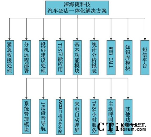 針對目前國內(nèi)汽車4S店的服務(wù)現(xiàn)狀,并結(jié)合4S店需求的獨(dú)特特點(diǎn),專為國內(nèi)汽車4S店量身打造的深海捷汽車4S店聯(lián)絡(luò)中心系統(tǒng),除具備呼叫中心基本功能外,還集成了分機(jī)遠(yuǎn)程部署、TTS功能、緊急救援處理模塊、投訴/建議受理模塊、WEB CALL模塊和短信平臺模塊等特色功能?傮w功能結(jié)構(gòu)圖如下: