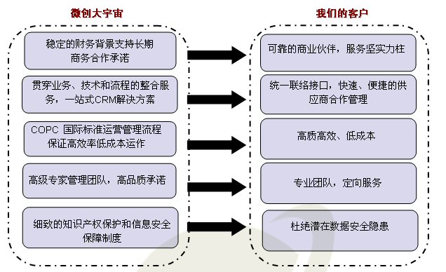 Wicresoft 微創(chuàng)軟件是上海聯(lián)和投資有限公司控股的國家重點軟件企業(yè),是微軟公司在華最重要的投資項目之一。自2002年5月成立以來,本著“迅捷、誠信、盡責(zé),打造值得信賴的國際化IT外包與服務(wù)提供商”的愿景,微創(chuàng)一直專注于信息技術(shù)外包(ITO)和業(yè)務(wù)流程外包(BPO)領(lǐng)域,不斷積累豐富的先進技術(shù)、細致高效的流程管理、靈活調(diào)配的規(guī);瘜I(yè)人員,旨在為客戶提供度身定制的高績效專業(yè)服務(wù),打造完美客戶體驗。