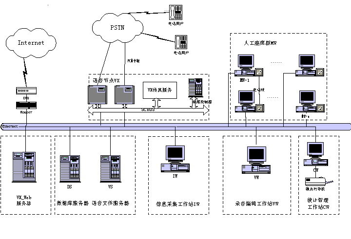 客戶服務(wù)中心系統(tǒng)包含智能排隊(duì)機(jī)(含接入服務(wù)器)、核心服務(wù)器CCS、交互式語(yǔ)音應(yīng)答系統(tǒng)IVR、語(yǔ)音傳真服務(wù)器、業(yè)務(wù)服務(wù)器、工作流服務(wù)器、數(shù)據(jù)庫(kù)服務(wù)器、Internet/Intranet服務(wù)器、人工座席、尋呼機(jī)接口,手機(jī)短消息接口等組成。如下圖所示為Runsun呼叫中心系統(tǒng)結(jié)構(gòu)圖: