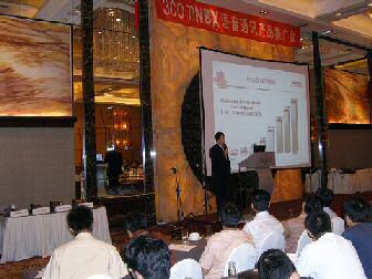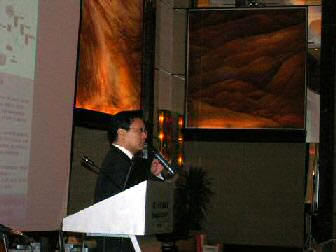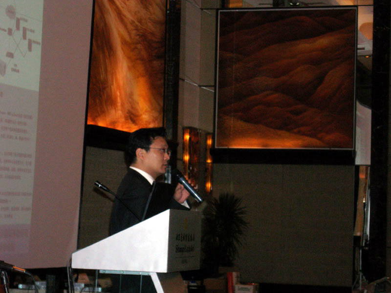 。。2005年8月24日,3Com NBX語音通訊產(chǎn)品推廣會于北京香格里拉大酒店成功舉辦。圖為3Com中國地區(qū)高級市場經(jīng)理朱海翔闡述3Com產(chǎn)品與市場(點(diǎn)擊察看大圖)