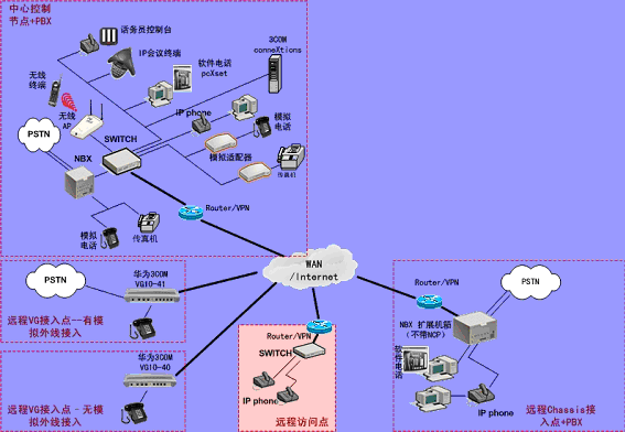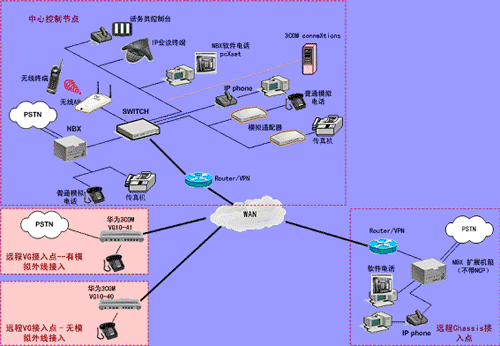 ③.遠程接入的辦公室不再需要專用的 PBX, 只需要將3Com NBX電話終端接入到WAN網中,就能地實現在WAN或Internet上與3Com