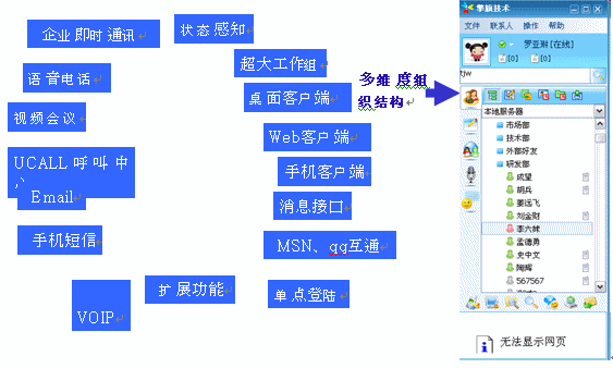 UcSTAR:Unified Communication Star,是擎旗技術(shù)研發(fā)的統(tǒng)一通訊平臺(tái),它為企業(yè)提供多種通訊手段(企業(yè)即時(shí)通信、視頻、語音、郵件、短信、電話、MSN/QQ互通等),并可融合企業(yè)的各種應(yīng)用系統(tǒng)(OA、ERP、CRM、網(wǎng)站、電子商務(wù)系統(tǒng)等);將企業(yè)對(duì)外溝通、銷售和服務(wù)、對(duì)內(nèi)溝通和協(xié)作無縫整合;輕松實(shí)現(xiàn)無地域/時(shí)間限制的,可管理、可控制、可擴(kuò)展的,集內(nèi)外部溝通、服務(wù)和銷售一體化的統(tǒng)一工作平臺(tái)。此外,它也可被分離應(yīng)用為企業(yè)IM及實(shí)時(shí)協(xié)作系統(tǒng)、多媒體呼叫中心系統(tǒng)、專業(yè)級(jí)的IP視頻會(huì)議系統(tǒng)等。