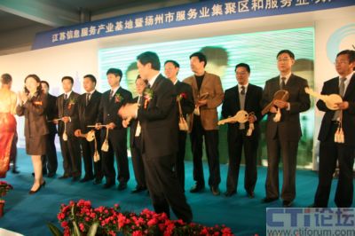 4月21日,江蘇信息服務(wù)產(chǎn)業(yè)基地暨揚(yáng)州市服務(wù)業(yè)集聚區(qū)和服務(wù)業(yè)項目推介洽談會在江蘇信息服務(wù)產(chǎn)業(yè)基地(揚(yáng)州)隆重召開,省信息產(chǎn)業(yè)廳副廳長龔懷進(jìn)、揚(yáng)州市委常委、常務(wù)副市長張京霞為省信息安全技術(shù)中心揭牌,中國網(wǎng)通集團(tuán)公司總工程師滕勇,神州數(shù)碼高級副總裁陳勇,上海萬得信息股份董事長陸風(fēng)等數(shù)十位集團(tuán)公司老總現(xiàn)場祝賀,同時IBM、AVAYA、優(yōu)勝資訊、神州數(shù)碼等60多家企業(yè)現(xiàn)場簽定了投資合作協(xié)議,而華潤通信、中國電信、酒店無憂、漢世紀(jì)等10家企業(yè)則從廣陵區(qū)委書記孔令俊手中接過了入駐金鑰匙,成為首批入駐江蘇信息服務(wù)產(chǎn)業(yè)基地的企業(yè),至此江蘇信息服務(wù)產(chǎn)業(yè)基地迎來首發(fā)項目招商的“開門紅”,江蘇信息服務(wù)產(chǎn)業(yè)基地也因此被業(yè)界冠以中國首家專業(yè)定位信息呼叫和數(shù)據(jù)處理產(chǎn)業(yè)的“中國聲谷”的美譽(yù)。