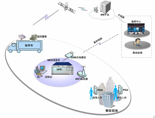 MDS調(diào)度機(jī)通過衛(wèi)星道與政府的NGN平臺(tái)對接,實(shí)現(xiàn)與整個(gè)城市的通信系統(tǒng)對接;并通過GSM、CDMA備份線路,實(shí)現(xiàn)多通信通道的實(shí)時(shí)切換,選擇最好的路由進(jìn)行通信。MDS調(diào)度機(jī)負(fù)責(zé)語音通訊、調(diào)度作業(yè)和指令消息轉(zhuǎn)發(fā);應(yīng)急指揮車配備調(diào)度機(jī)、調(diào)度臺(tái)、移動(dòng)調(diào)度終端、衛(wèi)星接收設(shè)備、監(jiān)控視頻設(shè)備及其他設(shè)備。所有的調(diào)度語音終端都可與MDS調(diào)度系統(tǒng)對接,實(shí)現(xiàn)調(diào)度功能及與其他的通信終端進(jìn)行通信。