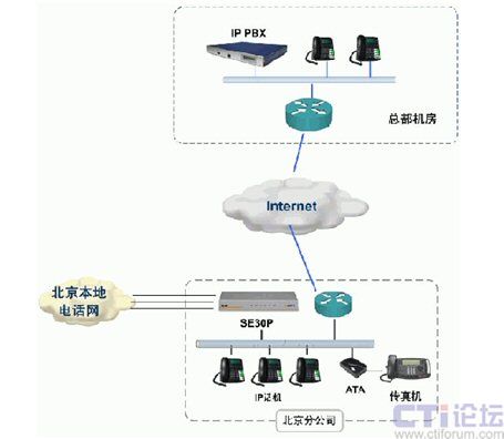 如上圖所示,通過SE30P的內置FXO接口,可以實現(xiàn)與北京PSTN網(wǎng)絡的互聯(lián),解決北京分公司與中國用戶的通信;通過SE30P的IP中繼方式,實現(xiàn)與總部的IP PBX互聯(lián),變國際長途為內部通話,為公司節(jié)省了大量辦公費用;公司內部使用IP話機作為人工總機和分機,并通過ATA實現(xiàn)傳真接入。
