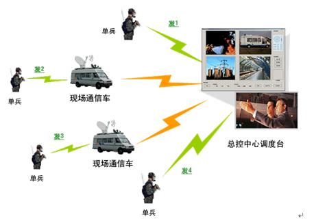 在具體應用中,工作人員(士兵)攜帶單兵背負終端深入現(xiàn)場(災區(qū)、廣場、戰(zhàn)場等),將現(xiàn)場視頻實時回傳到后方的應急通信車或指揮中心,同時現(xiàn)場人員可以和指揮中心建立雙向語音通信,指揮中心根據(jù)現(xiàn)場真實的視頻信息并結(jié)合現(xiàn)場人員語音匯報,可以做出更有針對性、更具準確性的指揮決策。