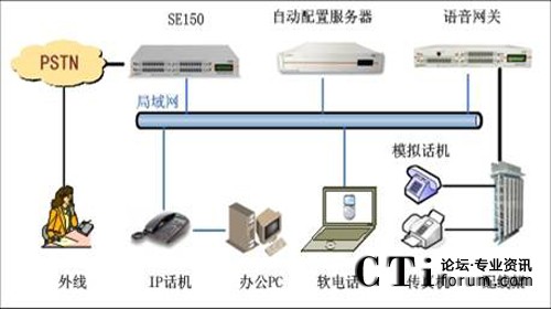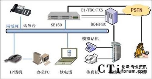 此方案適用于已經(jīng)部署了傳統(tǒng)PBX的企業(yè)。要求企業(yè)部署好數(shù)據(jù)網(wǎng)絡(luò),如果采用模擬終端,則企業(yè)的各個(gè)辦公點(diǎn)需要先將網(wǎng)絡(luò)線路和電話線路部署到位,同時(shí)企業(yè)原有的PBX要預(yù)留與SE150對接的接口。