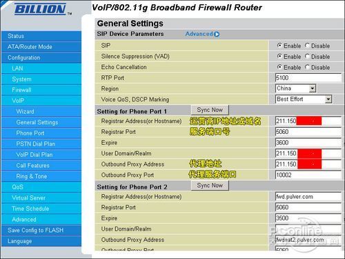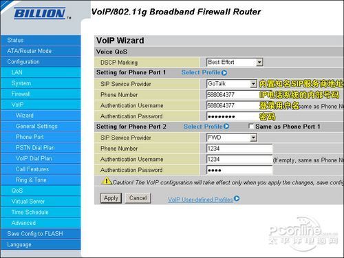 把申請得到的相關(guān)數(shù)據(jù)填入BiPAC 6404VGP中,在路由器后面接上電話就可以享受完全免費或超低價格的電話服務(wù)了。同一個SIP服務(wù)器下面的用戶互相撥打電話、收發(fā)傳真是免費的。
