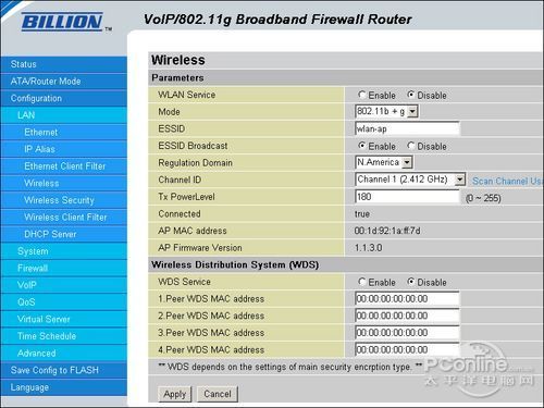 BiPAC 6404VGP的無線部分符合802.11b/g規(guī)范,最高無線速率可達54Mbps。無線部分的常規(guī)設(shè)置例如WIFI功能開關(guān)、SSID名稱自定義、SSID隱藏、信道選擇、WDS無線橋接等功能齊全。
