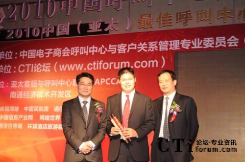 CTI論壇(ctiforum)10月14日消息(記者 潘婷婷):由中國(guó)電子商會(huì)呼叫中心與客戶關(guān)系管理專業(yè)委員會(huì)(CNCCA)主辦,CTI論壇承辦的2010中國(guó)呼叫中心產(chǎn)業(yè)峰會(huì)暨中國(guó)最佳呼叫中心頒獎(jiǎng)典禮于2010年9月28日在北京富力萬(wàn)麗酒店隆重舉行。本次大會(huì)吸引了來(lái)自全亞洲乃至世界范圍內(nèi)的權(quán)威專家學(xué)者、專業(yè)IT廠商以及金融、電信、政府、制造、電子商務(wù)、物流及零售、外包服務(wù)等行業(yè)中的領(lǐng)袖及專業(yè)人士,是亞太地區(qū)最大規(guī)模的呼叫中心及客戶關(guān)系管理領(lǐng)域的專業(yè)盛會(huì)。圖:七星藍(lán)圖科技有限公司總經(jīng)理孫必勇出席典禮并接受頒獎(jiǎng)