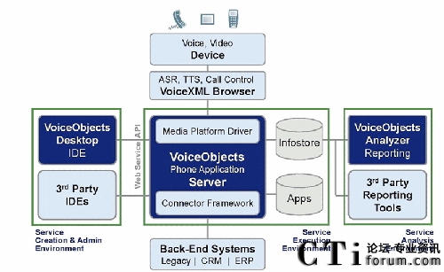 VoiceObjects體系結(jié)構(gòu)支持輕松地開發(fā)、部署和維護帶有語音、視頻、文本和移動互聯(lián)網(wǎng)接口的電話應(yīng)用。通過緊密集成提供實時分析的VoiceObjects分析器和提供應(yīng)用創(chuàng)建與維護的VoiceObjects桌面,VoiceObjects服務(wù)器成為提供動態(tài)對話和接口生成的執(zhí)行引擎。