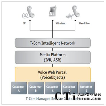 T-Com在2000年進(jìn)入競(jìng)爭(zhēng)激烈的受托管理業(yè)務(wù)市場(chǎng),并且很快從一個(gè)自產(chǎn)IVR系統(tǒng)過渡到開放標(biāo)準(zhǔn)的VoiceXML平臺(tái)。T-Com的標(biāo)語(yǔ)——“讓生活簡(jiǎn)單”——證明了要求給它的客戶及其每天1,000,000個(gè)呼叫提供7x24、可擴(kuò)展的和可靠的受托管理電話服務(wù)。但是,T-Com很快意識(shí)到需要額外的技術(shù)來(lái)補(bǔ)充這個(gè)新的VoiceXML平臺(tái)。