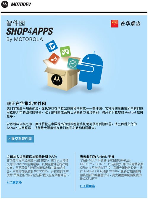 2月3日消息,摩托羅拉今日正式在華推出應(yīng)用程序商城SHOP4APPS,并取中文名為“智件園”。摩托羅拉在發(fā)給MOTODEV中國(guó)注冊(cè)會(huì)員的郵件中表示,摩托羅拉在中國(guó)推出的新款智能手機(jī)便可使用到智件園。圖:摩托羅拉發(fā)給MOTODEV注冊(cè)會(huì)員的通知郵件
