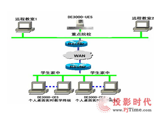 如上圖所示:DE3000系列中的DE3000-CES(個人桌面實時教學(xué)終端)主要用于學(xué)生在家里的PC上與學(xué)校的老師進(jìn)行實時的面對面授課。在學(xué)校的多媒體教室配備DE3000-UES(遠(yuǎn)程教育終端設(shè)備),在學(xué)生家中的電腦上安裝DE3000-CES(個人桌面實時教學(xué)終端),即可實現(xiàn)遠(yuǎn)程實時授課,其高質(zhì)量的音視頻效果與強大的數(shù)據(jù)功能,使學(xué)生猶如坐在教室里上課一樣,可體現(xiàn)出強烈現(xiàn)場感。