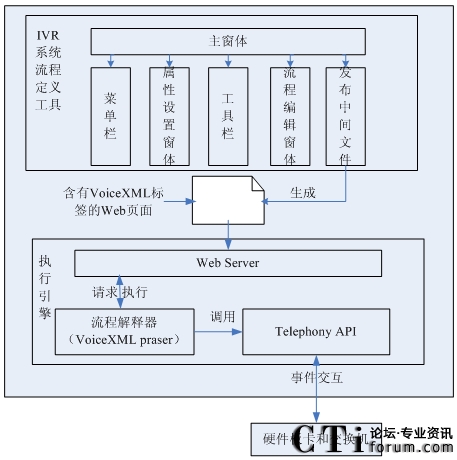 交互式語音應(yīng)答(IVR)系統(tǒng)是電話銀行呼叫中心系統(tǒng)的最前端,它的質(zhì)量直接影響整個(gè)系統(tǒng)的穩(wěn)定性和可擴(kuò)展性。本文設(shè)計(jì)的IVR系統(tǒng)主要分為兩個(gè)模塊:可視化過程定義工具(用戶交互接口)、流程執(zhí)行引擎。由于過程定義工具主要是面向用戶,它的設(shè)計(jì)規(guī)范首先要符合流程的定義規(guī)則,反應(yīng)到本文中即流程工具涉及到的節(jié)點(diǎn)類型均符合IVR的操作動(dòng)作和相關(guān)的業(yè)務(wù)動(dòng)作,同時(shí)還要生成符合流程執(zhí)行引擎能處理的文件格式。在流程執(zhí)行引擎方面,符合VoiceXML的設(shè)計(jì)框架,將Web應(yīng)用和語音應(yīng)用相結(jié)合。圖3.1 IVR系統(tǒng)整體結(jié)構(gòu)圖