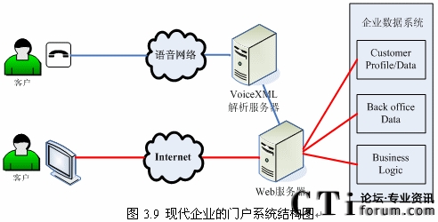 隨著Internet和Web技術(shù)的迅速發(fā)展,越來的企業(yè)開始建立自己的門戶網(wǎng)站,同時(shí)又擁有自己的IVR系統(tǒng)(如圖3.8所示),但是兩套系統(tǒng)完全獨(dú)立,語音系統(tǒng)和數(shù)據(jù)系統(tǒng)沒有任何交互或者只有很少的交互。而建立IVR系統(tǒng)的目標(biāo)就是給客戶更好的體驗(yàn),使客戶能方便的通過電話完成更多以前需要登陸企業(yè)門戶網(wǎng)站,或者親自去企業(yè)或其網(wǎng)點(diǎn)去辦理的業(yè)務(wù),這就需要IVR系統(tǒng)能跟后臺(tái)數(shù)據(jù)系統(tǒng)有更多更好的交互。“語音門戶”的概念出現(xiàn)也愈發(fā)的證明這一點(diǎn)。