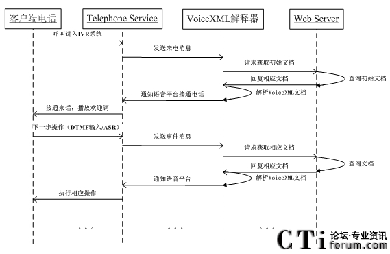 當(dāng)VoiceXML解析器做完解析工作之后,遇到需要語音操作時(shí),就得依靠調(diào)用Telephoney API來完成,同時(shí)Telephony Service需要向VoiceXML解析器去返回相應(yīng)的語音操作結(jié)果事件。圖3.15描述了這一過程。