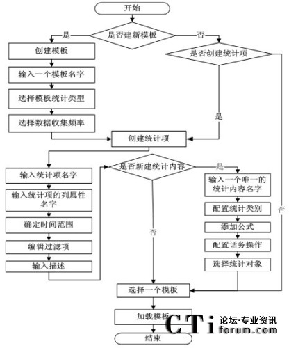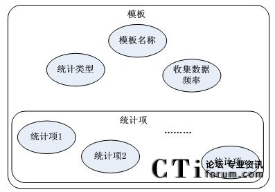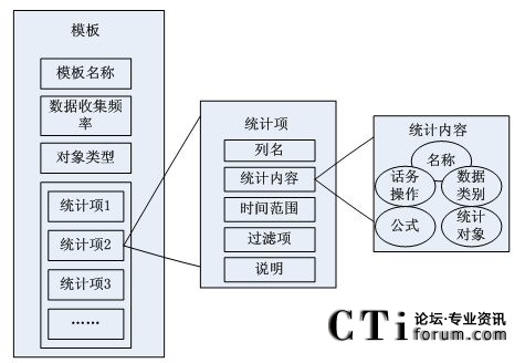 由模板結(jié)構(gòu)框架圖得知,模板包括模板名稱,數(shù)據(jù)統(tǒng)計(jì)對(duì)象,收集數(shù)據(jù)的頻率和多個(gè)基本統(tǒng)計(jì)項(xiàng)。其中,每個(gè)統(tǒng)計(jì)項(xiàng)對(duì)應(yīng)著統(tǒng)計(jì)對(duì)象(如:坐席,路由點(diǎn)等)的一條統(tǒng)計(jì)內(nèi)容信息(如:1小時(shí)內(nèi)的呼叫總量等)。然后由這些統(tǒng)計(jì)項(xiàng)和統(tǒng)計(jì)參數(shù)組合成模板,從而構(gòu)成對(duì)呼叫中心對(duì)象的統(tǒng)計(jì)信息。
