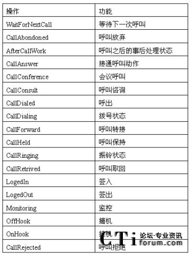 在呼叫中心服務(wù)器發(fā)送事件時(shí),它都會(huì)對(duì)事件的對(duì)象指定的一個(gè)狀態(tài)。在任何時(shí)間,ODS源數(shù)據(jù)庫(kù)中,每個(gè)對(duì)象都被指定成一個(gè)唯一的狀態(tài)。這些狀態(tài)都來(lái)自話務(wù)對(duì)象的操作。