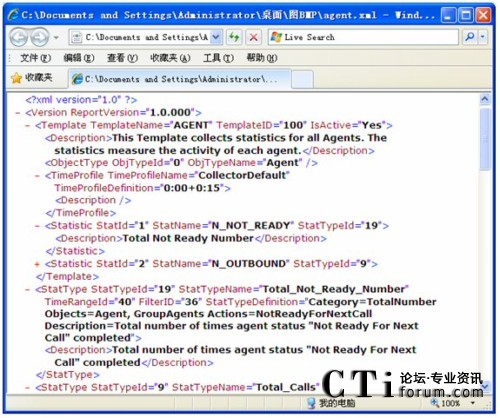 在模板導(dǎo)出的XML儲(chǔ)存圖中,ReportVersion屬性為報(bào)表系統(tǒng)的版本號(hào)。Template信息用來(lái)指定一個(gè)模板名字,給模板一個(gè)唯一的模板ID,再指定該模板是否激活,另外也為該模板添加了注釋。該例中是對(duì)所有坐席活動(dòng)的數(shù)據(jù)進(jìn)行統(tǒng)計(jì)。ObjectType為模板的統(tǒng)計(jì)類型,該模板中統(tǒng)計(jì)類型為坐席(Agent)。TimeProfile為設(shè)定收集的時(shí)間間隔,本例中為從每天的0點(diǎn)0分開始,每隔15分鐘收集一次。Statistic對(duì)應(yīng)了一個(gè)統(tǒng)計(jì)內(nèi)容配置,根據(jù)StatTypeID在下面將列出詳細(xì)內(nèi)容。本例中StatTypeID為19,下面的StatType中將會(huì)根據(jù)StatTypeID與之相對(duì)應(yīng),其中配置了Category,