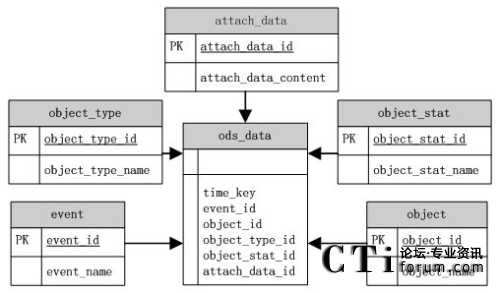 根據(jù)ODS源數(shù)據(jù)庫(kù)模型圖,ods_data表中存儲(chǔ)了事件發(fā)送的時(shí)間(time_key)、事件(event)、報(bào)表統(tǒng)計(jì)對(duì)象(object)、對(duì)象狀態(tài)(object_stat)、對(duì)象類型(object_type)以及一些隨路數(shù)據(jù)(attach_data)等信息。這些對(duì)象的詳細(xì)信息都是以各部分的ID來(lái)對(duì)內(nèi)容進(jìn)行關(guān)聯(lián)。