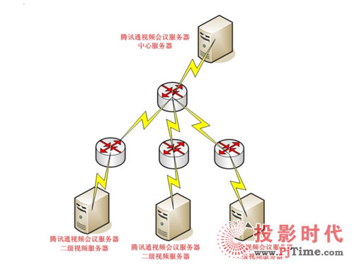 整套視頻系統(tǒng)基于原有IP數(shù)據(jù)網(wǎng)絡(luò),在中心機房建立視騰訊通視頻系統(tǒng)中心服務(wù)器,負(fù)責(zé)二級服務(wù)器的連接及控制,用戶數(shù)據(jù)和會議數(shù)據(jù)采用虛擬服務(wù)器管理技術(shù),即在不同的虛擬服務(wù)器的用戶和會議數(shù)據(jù)不能相互看到,當(dāng)需要召集不同虛擬服務(wù)器用戶的會議時通過管理員進(jìn)入后臺召集跨虛擬服務(wù)器的會議,以實現(xiàn)各個單位之間的大會議的需求。這樣既能快速召開部門內(nèi)小型視頻會議,同時又能分別在各省市支部召開區(qū)域型的大型會議。