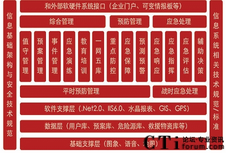 突發(fā)公共事件應急管理系統(tǒng)包括電話自動接處呼叫系統(tǒng)、指揮調度系統(tǒng),數字錄音系統(tǒng),地理信息系統(tǒng)、預測預警系統(tǒng),決策支持系統(tǒng)等。