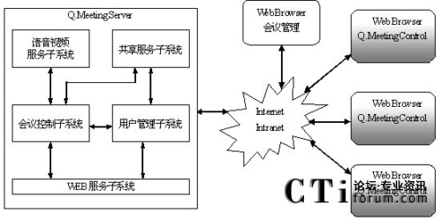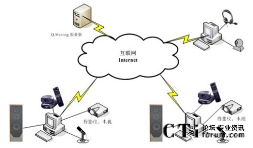 系統(tǒng)選用北京億方連線通訊技術(shù)有限公司具有國際先進(jìn)水平的全新第四代網(wǎng)絡(luò)視頻協(xié)作會(huì)議中心Q.Meeting為核心進(jìn)行構(gòu)建,該系統(tǒng)由會(huì)議服務(wù)器Q.Meeting Server和基于IE 瀏覽器的客戶端組成。Q.Meeting Server運(yùn)行于一臺(tái)服務(wù)器上,構(gòu)成網(wǎng)絡(luò)會(huì)議中心,提供會(huì)議控制、視頻服務(wù)、語音服務(wù)、共享服務(wù)、WEB服務(wù)和會(huì)議用戶管理等功能。所有參加會(huì)議的人員只需通過IE瀏覽器訪問會(huì)議中心網(wǎng)站就可以參加會(huì)議,通過訪問會(huì)議頁面和嵌于其中的客戶端插件Q.Meeting Control實(shí)現(xiàn)音頻和數(shù)據(jù)共享等交流。