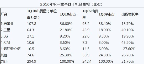 另外,福布斯雜志網(wǎng)站指出,摩托羅拉一季度僅有850萬(wàn)部的手機(jī)出貨量顯示,他們已經(jīng)被蘋果公司(一季度出貨iPhone 875萬(wàn)部)超越。也就是說(shuō),現(xiàn)在蘋果已經(jīng)成為美國(guó)第一大手機(jī)制造商?紤]到蘋果實(shí)際上只有一款手機(jī)產(chǎn)品,這一事實(shí)確實(shí)相當(dāng)驚人。如果iPhone繼續(xù)以目前的高增速發(fā)展下去,也許過(guò)不了多久它就將替代索尼愛(ài)立信,同樣進(jìn)入全球前五大手機(jī)廠商的行列。