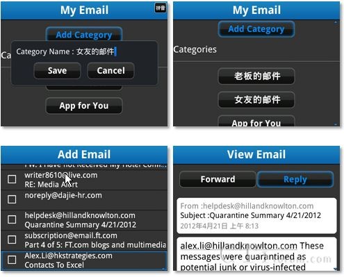 及時、安全的郵件收發(fā)是黑莓手機用戶鐘愛黑莓的重要原因之一。然而,當成千上百封郵件堆積在郵件系統(tǒng)內,疏于整理和歸類,以至于你無法找到或者挑選你想要的那封郵件中的信息時,你可能就沒那么Happy了吧?My Email應用,可以稱之為你郵件系統(tǒng)的“管家婆”,安裝了它之后,你可以將所有郵件有條理的進行分類管理:公私分明、客戶分明、項目分明、老板同事分明,想瀏覽哪類郵件一目了然。此外,對于那些及其重要的郵件,“管家婆”還可以幫你儲存在SD卡上,即使原郵件已經(jīng)被刪除,儲存的郵件也可以被找回,如此一來,有限的手機存儲空間中就不必再存儲大量無關緊要的各種郵件,騰點空間給你心水的各種音樂圖片和視頻吧。