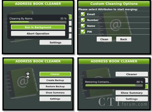 同事、同學、朋友、家人、客戶、合作伙伴…你的黑莓手機中存了多少聯(lián)系人了?其中又是否有重復存儲呢?一款名為Address Book Cleaner應用,可以幫助你整理和合并黑莓手機中的重復聯(lián)系人信息。該應用可設置按照重復姓名、號碼、電子郵件地址、PIN碼等進行查重、合并和刪除,并可在整理結束后給出整理報告。同時,Address Book Cleaner還可以隨時隨地將通訊薄中的聯(lián)系人信息進行備份和恢復,可讓用戶在無法與PC的BlackBerry Desktop Manager連接的時候,也可以輕松進行聯(lián)系人的備份和恢復操作。