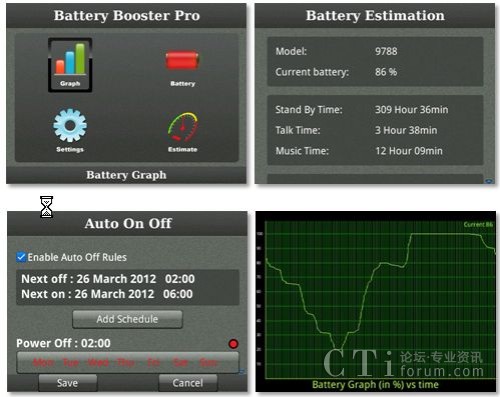 安裝了這么多應用,很多同學會考慮我的電池還能hold的住嗎?此次,特別為大家介紹一款名為Battery Booster Pro的手機電量管理應用,它可以通過自身具備的五大功能很好的幫用戶管理黑莓手機電量:1. 規(guī)則制定:用戶可以通過它為黑莓手機中的應用設定監(jiān)測規(guī)則,一旦用戶忘記關閉某應用,Battery Booster Pro就會跳出警告標志; 2. 自動開/關手機:用戶可以為自己的手機設定自動開關時間,以節(jié)省不必要得電量消耗;3. 電量提醒,當電量低于一定的百分比后,該應用就會自動提示用戶;4. 電量追蹤,Battery Booster Pro還可以通過直觀的圖表顯示出設備一天內的電量消耗狀況;5. 電量預測,該應用還可以預測出手機所剩的電量在待機、聽音樂和電話等情況下的工作時長。