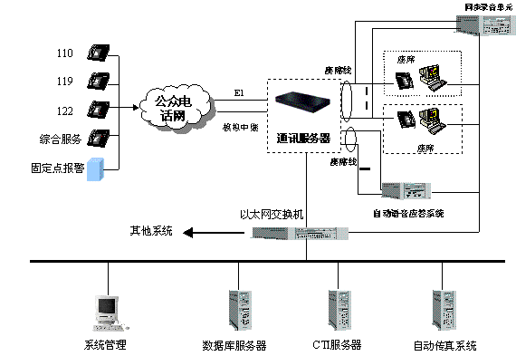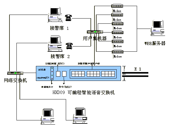 綜合接警平臺(tái)主要由hxd09可編程智能語(yǔ)音交換機(jī)和計(jì)算機(jī)網(wǎng)絡(luò)兩部分組成,交換機(jī)負(fù)責(zé)110、119、122報(bào)警電話(huà)的接入與分流及調(diào)度呼出等功能;計(jì)算機(jī)網(wǎng)絡(luò)則完成110、119、122報(bào)警信息的顯示、數(shù)據(jù)儲(chǔ)存、統(tǒng)計(jì)及信息查詢(xún)、發(fā)布功能。