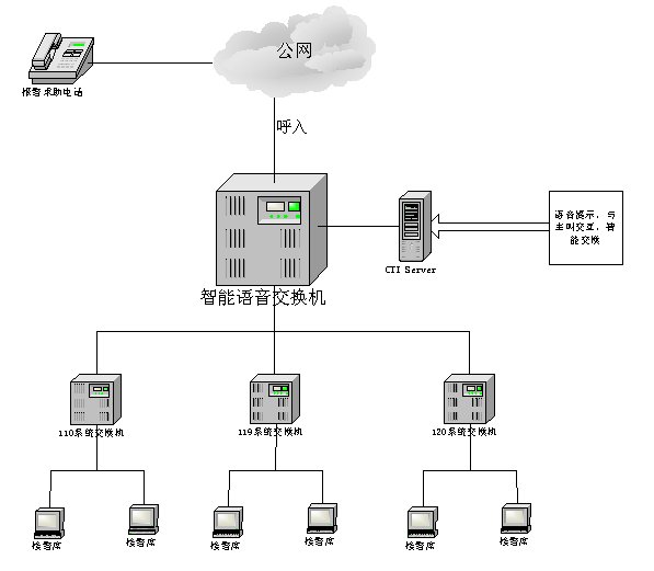簡(jiǎn)單的來(lái)說(shuō),系統(tǒng)就是把電話(huà)網(wǎng)和計(jì)算機(jī)網(wǎng)絡(luò)兩種截然不同的網(wǎng)絡(luò)有機(jī)的結(jié)合起來(lái),以電話(huà)網(wǎng)的方便和計(jì)算機(jī)網(wǎng)絡(luò)的強(qiáng)大,優(yōu)勢(shì)互補(bǔ)、協(xié)同工作。并集語(yǔ)音技術(shù)、呼叫處理技術(shù)、計(jì)算機(jī)網(wǎng)絡(luò)技術(shù)和數(shù)據(jù)庫(kù)技術(shù)為一體。如下圖: