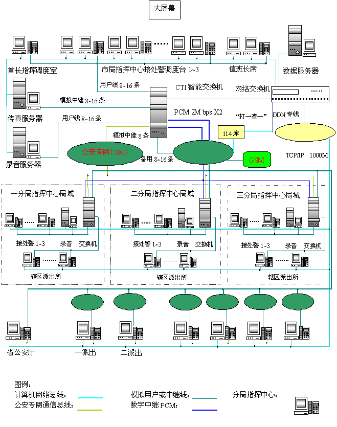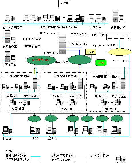 - 樹(shù)立大網(wǎng)絡(luò)概念:采用先進(jìn)的通訊、計(jì)算機(jī)網(wǎng)絡(luò)技術(shù)(采用CTI可編程交換技術(shù)),利用現(xiàn)有的通信資源,實(shí)現(xiàn)市局指揮中心與消防大隊(duì)、交警大隊(duì)、各派出所的計(jì)算機(jī)網(wǎng)絡(luò)及相關(guān)領(lǐng)導(dǎo)辦公室計(jì)算機(jī)大聯(lián)網(wǎng);形成全市范圍內(nèi)110、119、122有線(xiàn)、無(wú)線(xiàn)全方位立體調(diào)度語(yǔ)音通道大網(wǎng)。