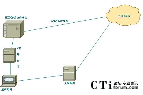 HXD09交換機(jī)通過(guò)EM接口與350M的語(yǔ)音線連接,當(dāng)需要呼叫某一無(wú)線終端時(shí),由座席端發(fā)起呼叫請(qǐng)求到無(wú)線網(wǎng)關(guān),當(dāng)獲取到無(wú)線網(wǎng)關(guān)返回的語(yǔ)音通道后,HXD09交換機(jī)將和350M系統(tǒng)對(duì)應(yīng)的語(yǔ)音通道連接起來(lái),實(shí)現(xiàn)有線座席和無(wú)線終端之間的通話,并可對(duì)通話進(jìn)行錄音;座席也可插入到無(wú)線終端或者某一集群之間,實(shí)現(xiàn)監(jiān)聽(tīng)或者插話,這一過(guò)程同樣可以全程錄音。