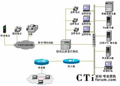 系統(tǒng)采用的硬件根據(jù)實際需求配置,如果實際接入電話容量小于30條線,系統(tǒng)與市話要采用普通模擬中繼線接入, 可選擇配置恒訊達公司HXD09的模擬板(AT0),申請的普通模擬中繼線需開通來電顯示業(yè)務(wù),如電信部門不開通項服務(wù),采用此種接入方式無法實現(xiàn)來電顯示功能;根據(jù)接入容量和話務(wù)員數(shù)量的總和計算卡的應(yīng)用數(shù)量,如實際接入電話容量大于等于30條線,則可采用E1接口數(shù)字中繼線接入,