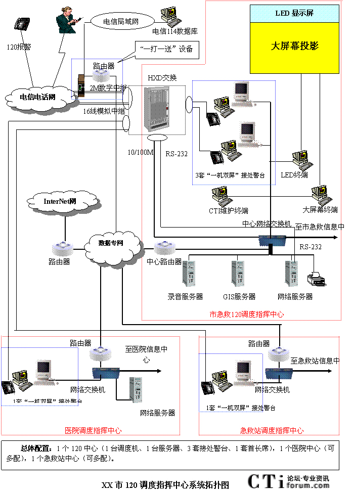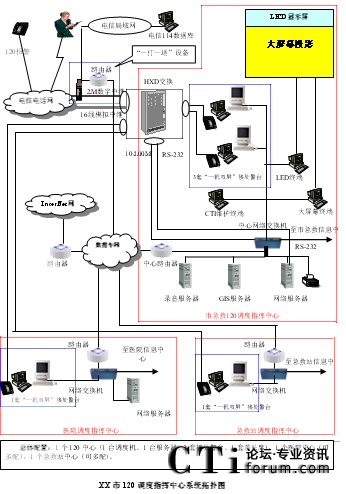 - 樹立大網(wǎng)絡概念:采用先進的通訊、計算機網(wǎng)絡技術(shù)(如CTI技術(shù)),利用現(xiàn)有的通信資源,實現(xiàn)市人民醫(yī)院120指揮中心與急救分站的計算機網(wǎng)絡及相關(guān)領(lǐng)導辦公室計算機大聯(lián)網(wǎng);形成全市范圍內(nèi)120有線、無線全方位立體調(diào)度語音通道大網(wǎng);為今后督查聯(lián)網(wǎng)、大聯(lián)動打下基礎。